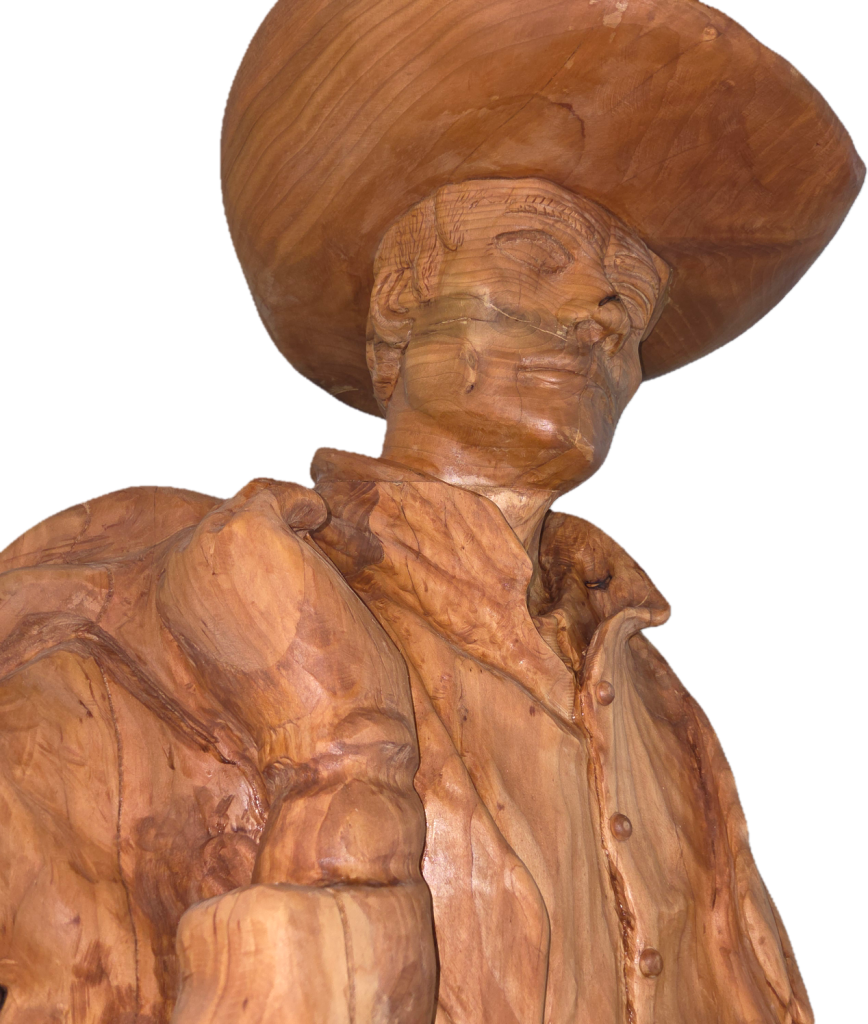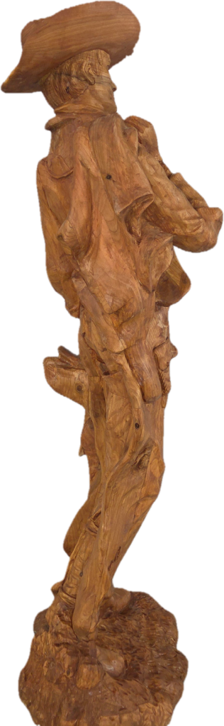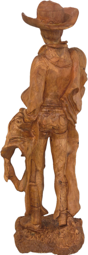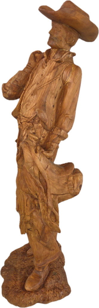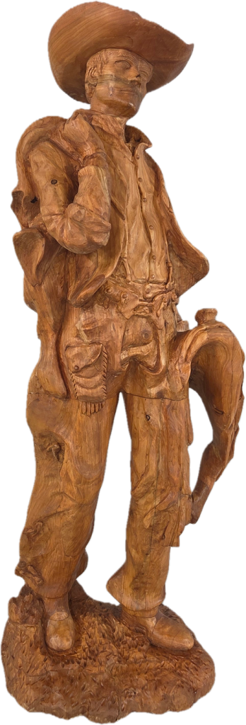 Dusty Life size Cowboy wood carving Size: 30″ wide x 28″ deep x 80″ tall 250# Recommend inside placement Price $25K USD FOB 95602